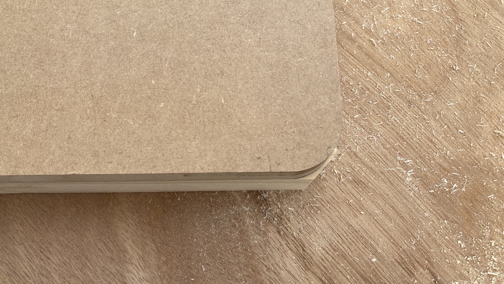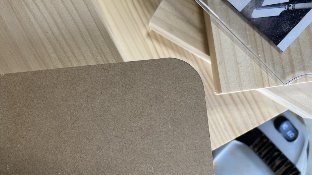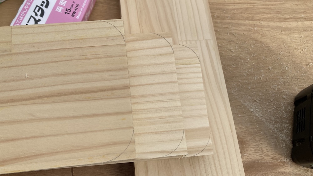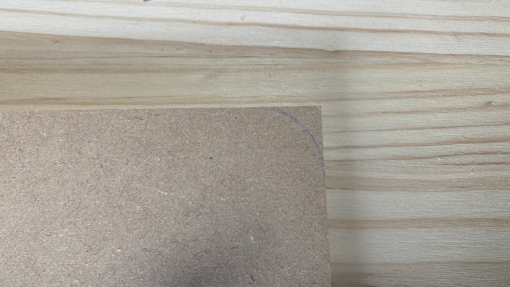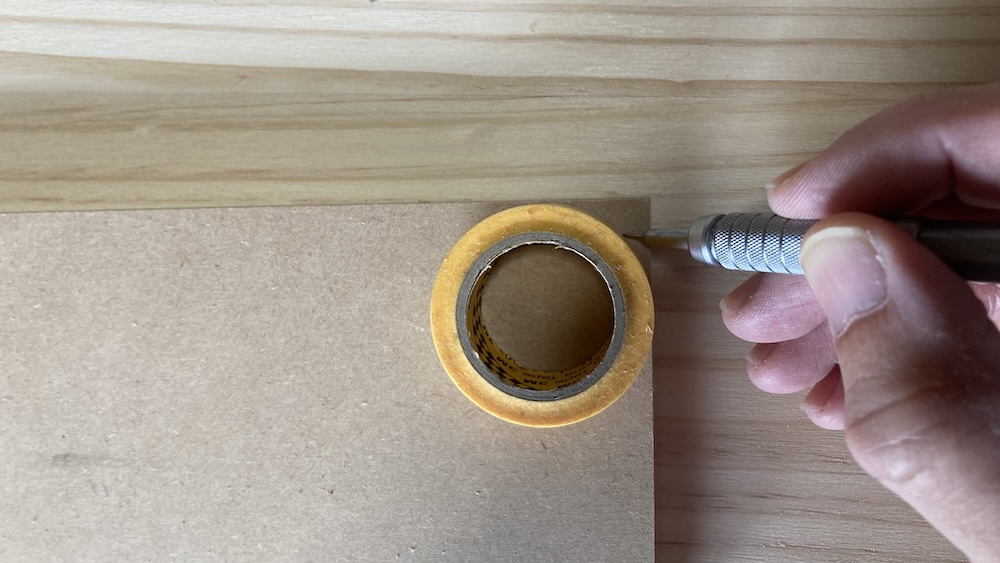 まずは丸い物を使ってMDF合板の角に丸い線を引く。なんでも良いので今回は近くにあったマスキングテープを使って線を引いた。
