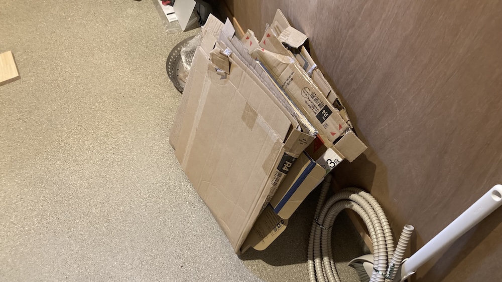 んでダンボールはこんな感じで溜めていく。ダンボールが勝手に広がらずにすっきり収まるし、下に紐とハサミを置いてあるのですぐにしばることもできる。