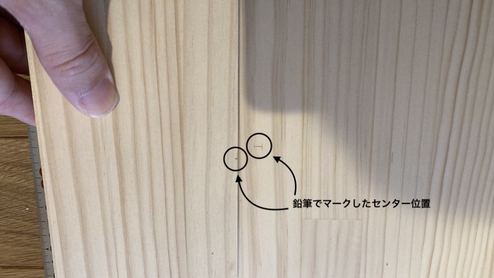 コンベックスとか曲尺とかを使って、それぞれの材料のだいたいセンターの位置になる部分に目印を書いておく。